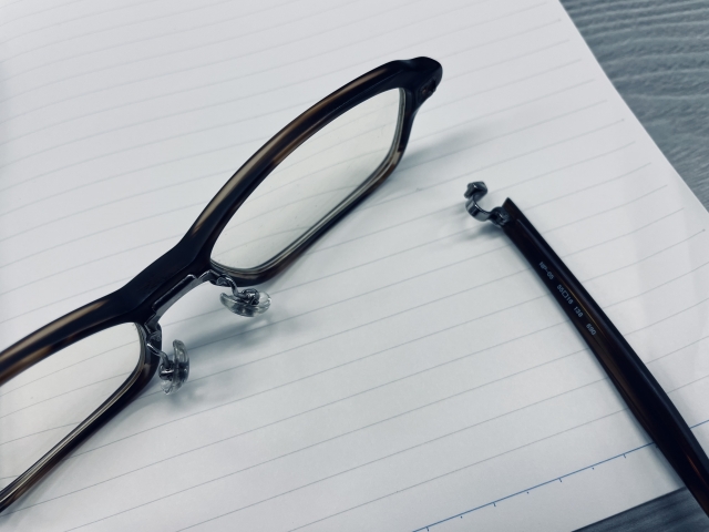 見てみるとテンプルの前方3センチくらいのところがポッキリ折れています。